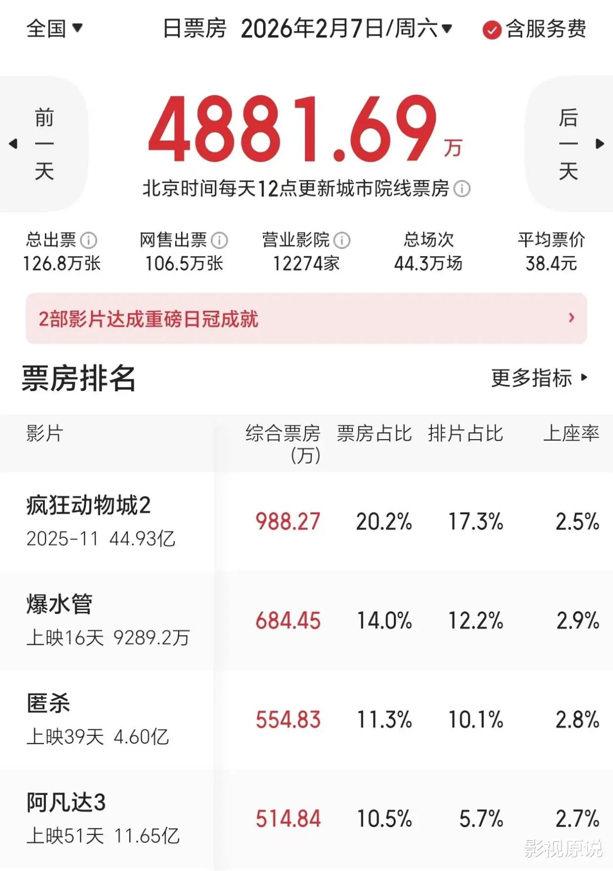 据国内的电影平台所露馅,本年2月7日今日,咱们中国内地商场大盘4800多万东谈主民币,而到手夺得日冠的却是还是上映了近三个月之久的老片《荒诞动物城2》。另外《匿杀》《阿凡达3》等一众也上映了有一个多月的“老电影”,也皆到手挺进了日票房榜前五名。